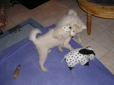 Seit dem 02.10.04 hat sich Nachwuchs bei uns eingestellt. Zwei Samojedenrüden aus dem Hause White House of Hope. Die zwei bringen ordentlich Leben in die Bude. Hier die ersten Bilder später mehr.